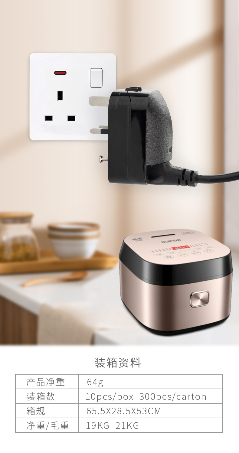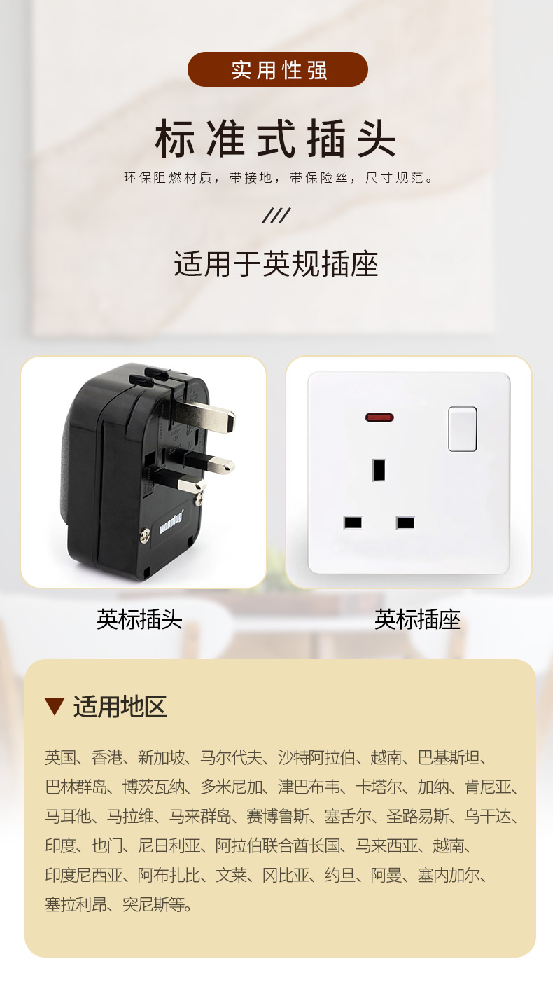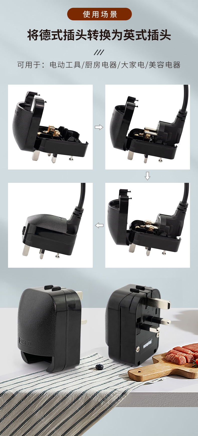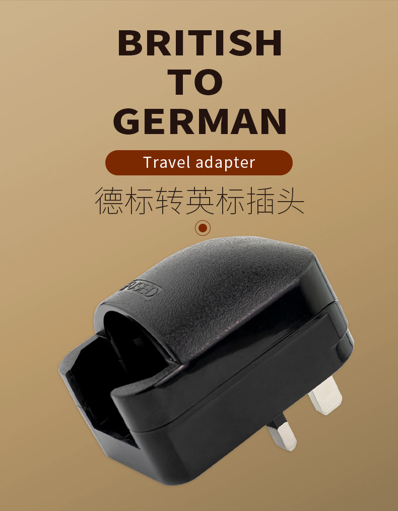 德式轉英式插頭規格:13A 250V作途:用于歐洲電器出口到英國使用。材質:PC、黃銅適用地區:英國、香港、新加坡、馬爾代夫、沙特阿拉伯、越南、巴基斯坦、巴林群島、博茨瓦納、多米尼加、津巴布韋、卡塔爾、加納、肯尼亞、馬耳他、馬拉維、馬來群島、賽博魯斯、塞舌爾、圣路易斯、烏干達、印度、也門、尼日利亞、阿拉伯聯合酋長國、馬來西亞、越南、印度尼西亞
