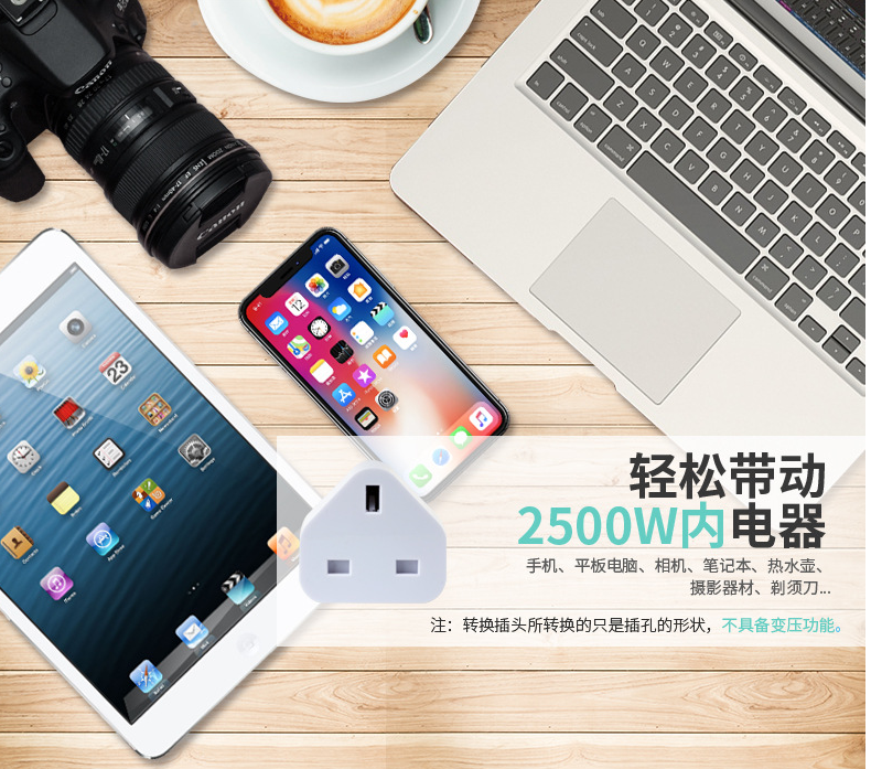 回國有了它輕松解決電器插不了的問題,可以帶動2500W以內的電器,比如:手機、平板電腦、相機、筆記本、熱水壺、攝影器材等等。