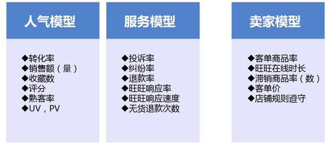 以上淘寶最基礎的六個模型下面我們講一下影響店鋪搜索權重最核心的3個模型:賣家模型丶服務模型和人氣模型。