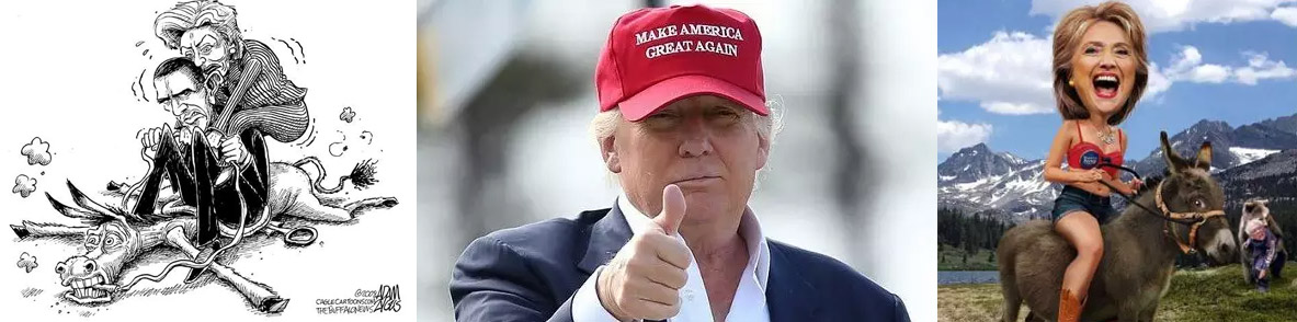 而驢代表什么? 驢就是民主黨的象征啊!如果半夜拉一群驢出來喊“大美興,希婆王”,說不定希拉里身體就變好了,共和黨的川普直接就失敗了。